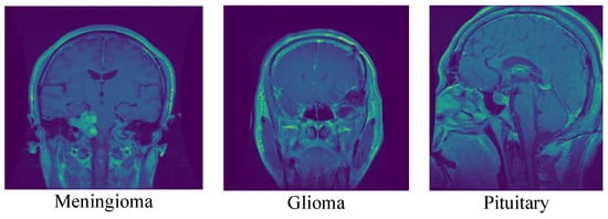 A total of 3064 T1-weighted contrast-enhanced MRI images from this dataset [22] have had the presence and location of brain tumors manually annotated by qualified radiologists. The images in the dataset have been acquired from 233 patients with different types of brain tumors, including glioma, meningioma, and pituitary tumors. The data are divided into two subsets: the training dataset, which contains 2204 images, and the testing dataset, which contains 860 images. The images are in 2D and have a resolution of 240 × 240 pixels with a pixel spacing of 0.9375 × 0.9375 mm. The images were converted from the “.mat” file format to the “.png” format. These images were manually segmented by the experts to highlight the tumor regions, and the segmentations were verified by a senior radiologist. The MRI images were acquired with a 1.5-T MRI scanner using the following imaging parameters: repetition time (TR) = 11 ms, echo time (TE) = 4.8 ms, slice thickness = 1.2 mm, and matrix size = 256 × 256. The acquisition was done using a head coil, and the data were processed using image registration, normalization, and skull-stripping techniques. This dataset contains only T1C MRI images and their segmentations and does not include diffusion-weighted imaging (DWI) data. The original dataset was shared by Jun Cheng [24,25] and can be accessed through the Figshare website with the https://doi.org/10.6084/m9.figshare.1512427 (Accessed on 4 April 2023). This dataset can be used for training and evaluating machine learning models for brain tumor classification. Figure 3 shows samples of these data for the three classes.