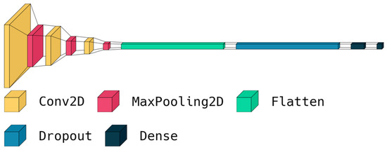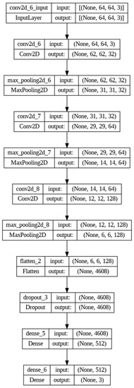 The first step involves importing the TensorFlow library as tf, which is a popular open-source software library for building machine learning models [26]. Next, a sequential model architecture is defined using the tf.keras.Sequential method. This method allows for the creation of a linear stack of layers that can be added to the model sequentially. The model architecture consists of several layers that perform specific operations on the input data. The Conv2D layer is added to the model to perform convolution operations on the input images. This layer has 32 filters of size (3,3) and uses the Rectified Linear Unit (ReLU) activation function. The purpose of this layer is to extract important features from the input images, which are then used for classification. A MaxPooling2D layer is added to the model to reduce the spatial dimensions of the output of the Conv2D layer. This layer helps reduce the computational complexity of the model and prevents overfitting. To increase the depth of the model, additional Conv2D and MaxPooling2D layers are added. These layers allow the model to learn more complex patterns and features from the input images. A Flatten layer is added to the model to convert the output of the MaxPooling2D layer into a one-dimensional array. This layer is essential for preparing the output of the model for classification. To prevent overfitting, a dropout layer with a rate of 0.5 is added. This layer randomly drops out 50% of the neurons in the previous layer during training, which helps reduce the dependence of the model on specific features and encourages it to learn more robust representations. A dense layer with 512 neurons and ReLU activation is added to make predictions. This layer takes the flattened output of the previous layer as input and performs a linear transformation on it. Finally, a dense layer with three neurons and SoftMax activation is added to classify the brain tumors into three classes: meningioma (1), glioma (2), or pituitary tumor (3). The SoftMax activation function is used to convert the output of the last layer into a probability distribution over the three classes. The visualization of the proposed deep model is shown in Figure 7.