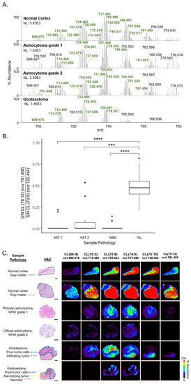 Aberration in CL molecular diversity has been associated with numerous pathologies [5,8,9], and has been increasingly investigated for its role in cancer [7,10,11,12,13,14,15,16]. Changes in CL content in cancer tissues are commonly studied using high-performance liquid chromatography mass spectrometry (HPLC-MS). HPLC-MS has been used to characterize CL species in human non-small cell lung carcinoma cells [12], prostate cancer cells [10], and hepatocellular carcinoma tissue [13], providing new insights into biological mechanisms involved in cancer development. A decrease in CL content and modification of CL molecular species was observed in glioma-susceptible brain [15] and xenograft glial cell tumors in comparison with normal brain in murine models of brain tumors [14]. In particular, this alteration in CL composition in glioma and tumor-susceptible tissue was associated with a significant reduction in the activity of mitochondrial respiratory chain protein complexes. While these studies provide evidence of the importance of CL in glioma pathophysiology, changes in CL distribution in histologically diverse human glioma tissues have not been extensively studied. Moreover, investigations of CL distribution within the tumor microenvironment could provide deeper understanding of their molecular role in tumor development. Yet, while HPLC-MS provides quantitative lipid analysis from biological samples, tissue homogenization precludes a spatial understanding of lipid profiles within heterogenous tissues.