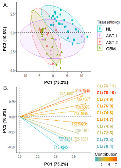 Principal component analysis of CL profiles extracted from regions of pure tumor cell or normal grey matter analyzed by DESI-FAIMS-MS. (A) Score plot of individuals. S/N of CL species were extracted from DESI-FAIMS-MS pixels corresponding to regions of pure, viable tumor or normal grey matter and averaged on a per-patient basis. Data are centered and log transformed. PC1 and PC2 account for 75.2% and 10.8% of dataset variability, respectively. 90% concentration ellipses are shown. (B) Loading plot showing the direction of contribution of the 10 m/z features with the highest contribution to the PCs. Feature vectors and their corresponding molecular species are colored according to their contribution (%).