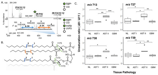 CID-UVPD-MS analysis of double bond isomer ratios. (A) CID (top) and CID-UVPD (bottom) mass spectra from MSn analysis of m/z 727 (CL(72:4)). (B) Fragmentation map of CL(72:4). Fragments resulting from MS2 analysis are depicted in green. Double bond isomer fragments diagnostic of Δ9 and Δ11 unsaturation are depicted in blue and orange, respectively. (C) Boxplots comparing unsaturation ratios for FA(18:1) chains from CL species containing at least 3 FA(18:1) chains at m/z 713 (upper left), 727 (upper right), 738 (bottom left) and 739 (bottom right) among NL (N = 8), AST grade 1 (N = 3), AST grade 2 (N = 5), and GBM (N = 8) mitochondrial lipid extracts. Shapiro-Wilk tests were used to determine normality of distributions to inform use of non/parametric testing. t-tests (m/z 713, 727, 738) and Wilcoxon (m/z 739) for pairwise hypothesis tests and Holm adjustment for multiple comparisons. All pairwise comparisons were performed, only significant results are displayed (* p ≤ 0.05, ** p ≤ 0.01, *** p ≤ 0.001).