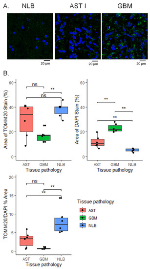 Changes in mitochondrial and cellular density are observed in immunofluorescence images of AST grade I and GBM tissues versus NLB tissue. (A) Representative confocal images for NL, AST grade 1, and GBM tissues stained with anti-mitochondrial antibody (green) and DAPI nuclear stain (blue). Scale bar = 20 µm. Brightness was increased uniformly by 20% for both channels in all images. (B) Area fraction analysis comparing area % positive for DAPI nuclear staining (top left), area % positive for TOMM20 staining (top right) and TOMM20 area % normalized by DAPI area % (bottom left). For NL (N = 3), AST 1 (N = 3), and GBM (N = 3), area fraction ratios obtained from 2 regions of interest were averaged from regions of pure tumor cells or normal grey matter. Wilcoxon with holm adjustment for multiple comparisons was used to determine differences among groups. ** p ≤ 0.01; ns, not significant.