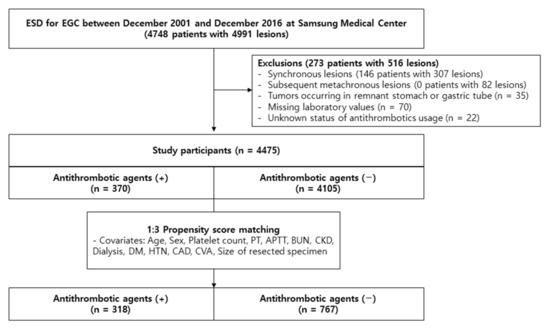 Flowchart showing the selection of patients for this study. ESD, endoscopic submucosal dissection; EGC, early gastric cancer; PT, prothrombin time; APTT, activated partial thromboplastin time; BUN, blood urea nitrogen; CKD, chronic kidney disease; DM, diabetes mellitus; HTN, hypertension; CAD, coronary artery disease; CVA, cerebrovascular accident.