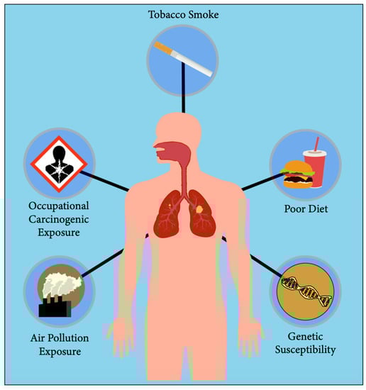 Lung cancer is the leading cause of cancer death. The two major types are small cell and non-small cell; 85% are non-small cell lung cancer (NSCLC). Within NSCLC, there are three subtypes: adenocarcinoma, squamous cell carcinoma, and large cell carcinoma [1]. Cigarette smoking is the leading cause of lung cancer; however, there are several other risk factors, such as sustained exposure to air pollution, occupational carcinogenic exposures, genetic susceptibility, and poor diet [2] (Figure 1). Many patients with no smoking history or a history of other risk factor exposure also develop lung cancer and there is an urgent need for effective therapies to treat and cure lung cancers.