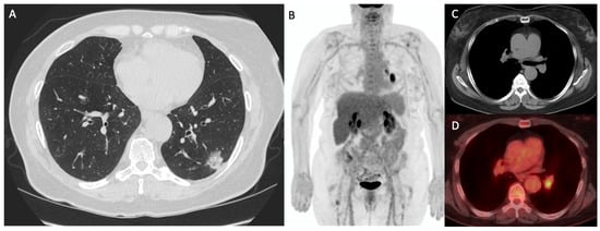 Imaging algorithms for the evaluation of non-small cell lung cancer (NSCLC) have evolved over the past decades. While chest radiography and computed tomography (CT) remain important tools in screening and anatomic localization, the addition of metabolic assessment with positron emission tomography (PET)/CT has been shown to impact prognosis and to help guide a patient’s treatment strategies [15,16] (Figure 2, Figure 3 and Figure 4).