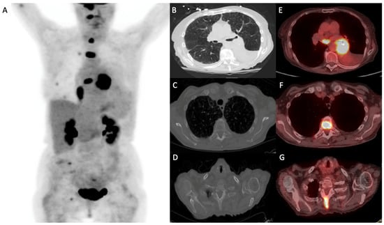 Demonstrates a 68-year-old man with biopsy-proven left lung squamous cell carcinoma (Stage: T4N2M1c). (A) 18F-FDG-PET/CT maximum intensity projection showing left lower lobe perihilar neoplasm invading the mediastinum, narrowing the left main bronchus with post-obstructive atelectasis; a biopsy demonstrated squamous cell carcinoma. (B–D) CT images and (E–G) fused images demonstrate enlarged FDG-avid subcarinal node suspicious for metastasis and multiple FDG-avid osseous lesions, with some lytic, and others CT-occult, consistent with metastases.