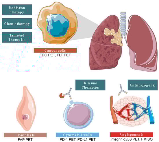 Overview of the available imaging and therapy options for patients with NSCLC. Treatment now includes chemotherapy, radiation therapy, targeted therapy, and immunotherapy. PET imaging and molecular radiotherapy targets include FDG, FLT, FAP, PD-1, PD-L1, integrins, and fMISO.