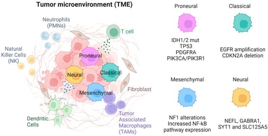 Glioma cells exist in a network with cells more central to the tumor mass being connected by a synaptic network, with invading tumor cells at the periphery being unconnected []. The tumor cell components of the TME comprise stem cells like glioma cells and differentiated glioma cells. The latter forms a heterogenous group defined by differing molecular and transcriptomic signatures [].