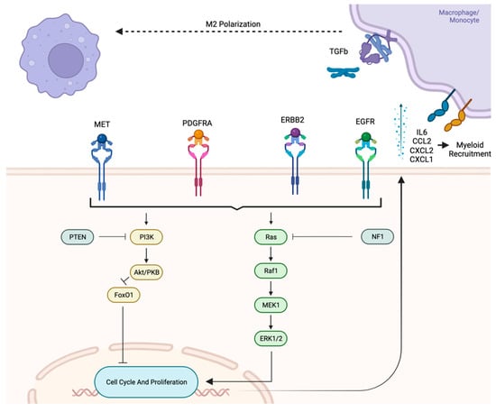 A major contributing factor to strong tumoral influence on the TME is the crossover of oncogenic pathways that drive anti-inflammatory characteristics. These pathways result in cytokine, chemokine, and receptor/ligand expressions that create an anti-inflammatory TME phenotype. A variety of anti-inflammatory mechanisms have been linked to common oncogenic pathways found in GB. These include mutations in PI3K, Ras-MAPK, WNT/Beta-catenin, and p53 pathways [].