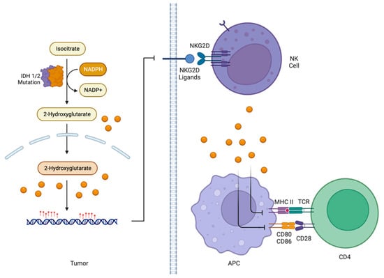 2-Hydroxygluterate produced by IDH1/2-mutant tumors may be able to evade immunity by downregulating MHC II and CD80/CD86 expression on APCs and downregulating NKG2D Ligands on the surface of tumor cells.