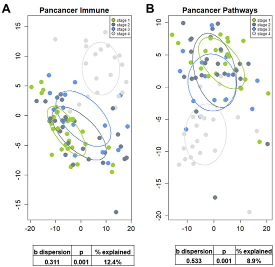 Principal component analysis (PCA) of gene expression data from PanCancer Immune Profiling panel (A) and PanCancer Pathways panel (B). Ellipses were drawn using the standard deviation of point scores. Log2-transformed gene expression data were used. Insert: Permutational multivariate analysis of variance (PERMANOVA) test results including beta dispersion, percentage of variance explained, and p value.