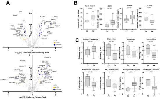 Differentially expressed genes in F4 livers compared to F3 livers. (A) Volcano plots showing gene expression changes using PanCancer Immune Profiling panel (top) and PanCancer Pathways panel (bottom). Log2 fold change (x-axis) and minus log10 p-value (y-axis) were used. Genes with FC ≥ 1.5 or ≤−1.5 and p ≤ 0.05 are shown in orange. Genes that remained significant after adjustment with the Benjamini–Hochberg method are shown in blue. (B) Box plots of immune cell type scores in F3 and F4 livers. (C) Box plots of pathway scores in F3 and F4 livers. Cell type and pathway scores were obtained using NanoString advanced analysis modules. p values in panels B and C were calculated using Mann–Whitney test.
