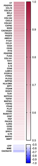 To identify genes that are associated with the progression of liver fibrosis from F1 to F4, we performed Spearman correlation analyses between the expression levels of all detected genes and fibrosis stages in the 99 NAFLD patients (Figure 3, Supplementary Table S3). As anticipated, a strong positive correlation was observed for collagen type 1 alpha 2 and type III alpha 1 chains (Col1A2, Col3A1) (r = 0.75, p < 0.001; r = 0.72, p < 0.001). Other genes with strong positive correlations included complement C7 (C7) (r = 0.73, p < 0.001); BCL2 apoptosis regulator (BCL2) (r = 0.80, p < 0.001); platelet-derived growth factor receptors alpha and beta (PDGFRA, PDGFRB) (r = 0.79, p < 0.001; r = 0.71, p < 0.001); calcium voltage-gated channel auxiliary subunit alpha2delta 1 (CACNA2D1) (r = 0.75, p < 0.001); CCL19 (r = 0.75, p < 0.001); jagged canonical notch ligand 1 (JAG1) (r = 0.74, p < 0.001); and SRY-box transcription factor 9 (SOX9) (r = 0.74, p < 0.001). The strongest negative correlations were observed for MME (r = −0.68, p < 0.001); calcium voltage-gated channel subunit alpha1 H (CACNA1H) (r = −0.68, p < 0.001); interleukin 10 (IL-10) (r = −0.62, p < 0.001); IL-6 receptor (IL-6R) (r = −61, p < 0.001); and complement factor properdin (CFP) (r = −0.60, p < 0.001).