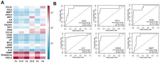 Gene predictors of fast fibrosis progression in NAFLD patients with F1/F2 liver fibrosis. (A) Heatmap of genes with significant differential expression in fast progressors (F1-P and F2-P). (B) Receiver operating characteristic (ROC) curves for selected genes with highest performance in discriminating fast progressors. The true-positive rate (sensitivity) is plotted as a function of the false-positive rate (100 specificty). Area under the curve (AUC) values as well as 95% lower and upper confidence intervals are shown for SOX9, THY-1, CD3D, IL13, HSPA6, and MMP7.