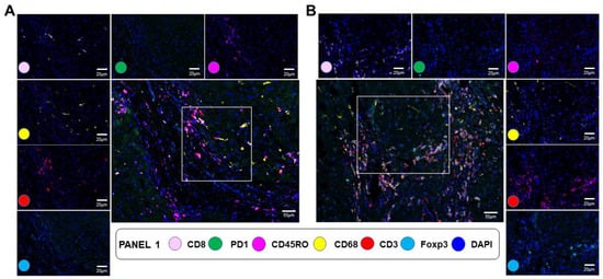 Multiplex IF T-cell panel comparing F1/F2 and F3/F4. This figure includes representative data from F1/F2 (A) vs. F3/F4 (B) liver biopsies. A composite image showing all markers of the panel, activated simultaneously, is shown in the middle (scale bar: 50 μm). The figure also includes individual composite images showing the CD8-positive expression (pink—opal 540), PD1-positive expression (green—opal 650), CD45RO=positive expression (magenta—opal 570), CD68-positive expression (yellow—opal 520), CD3-positive expression (red—opal 690), and Foxp3-positive expression (cyan—opal 620) of immune cells using inForm® image analysis software, Akoya bioscience (scale bar: 20 μm; Vectra Polaris scanner). The panel also includes a universal biomarker for nuclear detection (blue—DAPI).