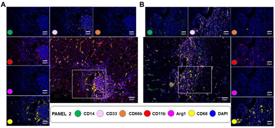 Multiplex IF myeloid cell panel comparing F1/F2 and F3/F4. This figure includes representative data from F1/F2 (A) vs. F3/F4 (B) liver biopsies. A composite image showing all markers of the panel, activated simultaneously, is shown in the middle (scale bar: 50 μm). The figure also includes individual composite images showing CD14-positive expression (green—opal 650), CD33-positive expression (pink—opal 540), CD66-positive expression (orange—opal 570), CD11-positive expression (red—opal 690), ARG1-positive expression (magenta—opal 570), and CD68-positive expression (yellow—opal 520) of immune cells using inForm® image analysis software, Akoya bioscience (scale bar: 20 μm; Vectra Polaris scanner). The panel also includes a universal biomarker for nuclear detection (blue—DAPI).