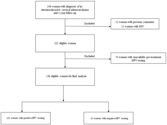 Two hundred forty-eight consecutive women with in situ/microinvasive and a 5-year follow-up was included during the study period. After excluding 100 cases, 148 eligible women were analyzed (Figure 1). In total, of 11 women were excluded for previous conizations, 15 were excluded because they were immunocompromised, and, finally, 74 patients were excluded due to the unavailability of pre-treatment HPV testing.