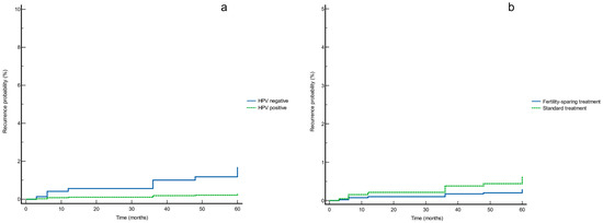 Cervical glandular lesions, unlike their squamous counterparts, are characterized by a higher rate of skip-lesions, and more aggressive behavior, resulting in a higher recurrence rate [24]. A wide range is described in the literature for relapses in in situ or microinvasive AC ranging from 2 to 14% [19,20,21,22,23]. The present study found a recurrence rate of 7.4%, including 2.7% of invasive relapse, within the range reported by previous studies. These numbers raise concerns about the possibility of conservative rather than standard treatment in women wishing to become pregnant. However, recent evidence has shown similar outcomes regarding recurrence and survival in women treated conservatively vs. standard options. In a study including 1567 women with microinvasive AC, radical treatment did not show better survival than conservative treatment [20]. Likewise, Liu et al. showed the efficacy and safety of cervical conization as a treatment option in 310 women with in situ AC [24]. In line with these results, our study also showed that the type of treatment did not affect the recurrence outcomes in HPV-positive and HPV-negative women. Concerning these data, however, it should be emphasized that our sample was primarily divided based on HPV status and not on follow-up outcomes.