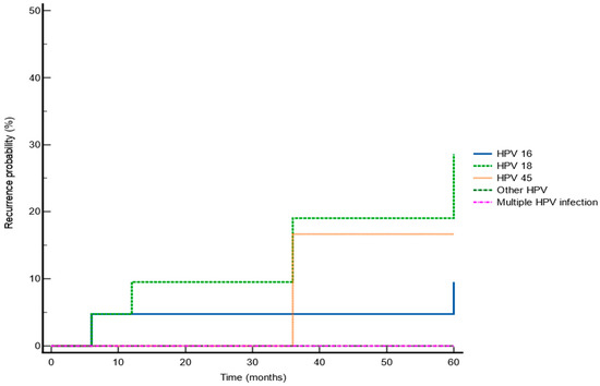 The Kaplan–Meier survival analysis showed a higher recurrence rate for HPV-18 than HPV-16 and HPV-45 (28.57%, 9.52%, and 16.67%, respectively, p = 0.046) (Figure 3).
