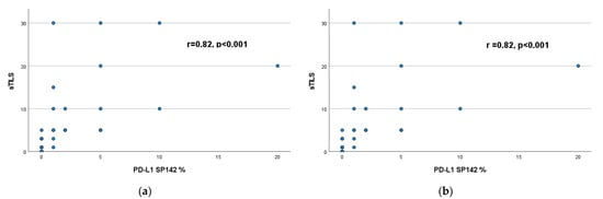 (a) Correlation between the percentage of sTILs and the PD-L1 SP142 score. (b) Correlation between the percentage of sTILs and the PD-L1 22C3 score.