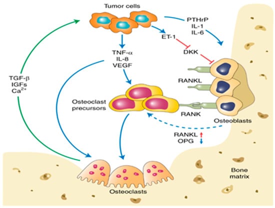 The incremental process of bone metastasis development is initiated by establishing a premetastatic niche at distant organs created by several tumor-derived factors (CCL2, IL6, lysyl oxidase (LOX), and Dickkopf WNT signaling pathway inhibitor 1 (DKK1)) of the primary tumor. Disseminated tumor cells enter the bone via parenchymal tissue by degrading the vascular basement membrane of blood and lymph vessels. Bone metastases are categorized as either osteolytic or osteoblastic (osteosclerotic), while osteolytic metastasis lesions are the dominant type. Upon entry into the bone microenvironment, tumor cells change their biological phenotype to an aggressive osteolytic phenotype [46,47]. Furthermore, tumor cells can survive and initiate their growth in a bone microenvironment due to the upregulation of several signaling pathways of tumor cells, including WNT, NF-κB, and CREB. Several cytokines and chemokines that are typically produced by bone cells to support bone homeostasis also foster the growth of tumor cells within bone tissues. For example, osteoblasts generate osteoprotegerin (OPG), a decoy receptor-to-receptor activator of NF-κB ligand (RANKL) that curtails osteoclast activation. RANKL plays a vital role in bone resorption but can also prompt bone metastasis by recruiting RANK-expressing cells directly to the bone [47,48,49]. RANK, RANKL, C–X–C motif chemokine receptor type 4 (CXCR4), and CXCL12 are of great importance for homing BCCs to the bone. Meanwhile, the release of essential tumor growth factors, such as transforming growth factor β (TGF-β), VEGF, IGFs, and BMPs, by tumor cells activates osteoclasts and stromal cells, as well as promotes angiogenesis and tumorigenesis [47,50]. Extravasated tumor cells to bone may grow immediately or enter a dormant state that may last for years, and they can be reactivated at any timepoint to create metastasis. The detailed molecular mechanism of BC bone metastasis is provided in Figure 1 [51].