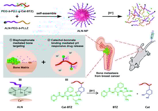 Schematic depicting the generation of ALN-NPs, as well as the process of combined bone-targeting and pH-responsive release of bortezomib resulting from the aryl boronate linkage as an antimetastatic therapy. ALN: alendronate; Cat: catechol; BTZ: bortezomib [54].