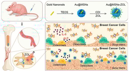 Bone-targeted nanoplatform combining zoledronate and photothermal therapy in order to treat breast cancer bone metastasis. The system contains gold nanorods enclosed inside zoledronic acid-functionalized mesoporous silica nanoparticles (Au@MSNs) [53]. (Reprinted/adapted with permission from Ref. [53]. 2023, Marya Ahmed).