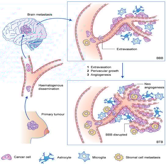 In contrast to other metastatic sites, BC brain metastases demonstrate a prolonged latency following the initial diagnosis of BC, due to the presence of the blood–brain barrier (BBB). The BBB is a highly specialized structure that consists of endothelial cells (ECs), tight junctions (TJs), astrocytes, pericytes, microglia, basement membranes, transporters, and enzymes. The BBB controls the permeability of the brain to macromolecules and is implicated in transmitting signals and upholding central nervous system homeostasis [76,77]. Hence, discovery of the biological pathways and regulatory molecules involved in the movement of biomolecules across the BBB is fundamental for BC brain metastasis prevention. Most cancer cells, including BC, utilize a paracellular mode of entry through BBB, whereby BCCs traverse through ECs by disrupting the intercellular junctions. Elongated metastatic cells round up and form cytoplasmic protrusions to expand the surrounding vascular wall, before or during the process of extravasation, with this process happening exclusively in capillaries and post-capillary venules that lack smooth muscle cells [76,78]. Intriguingly, the disruption to EC junctions seems to be repaired after paracellular extravasation, without substantial damage to the BBB [27]. As BC cells gather along the brain ECs, the previously intact BBB transforms into a permeable blood–tumor barrier (BTB) through vascular remodeling of pre-existing brain vessels, along with downregulation of the basement collagen membrane part IV and laminin α2 [27,79]. Subsequently, a change in pericyte phenotype involving the altered expression of desmin and CD13 affects the permeability of the barrier, as seen in BC brain metastasis [79]. These changes allow metastatic BC cells to easily cross the BBB. The steps involved in brain metastasis of breast cancer are illustrated in Figure 4 [80,81].