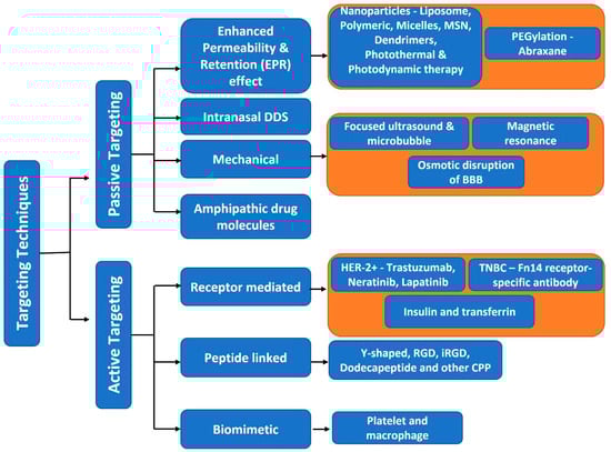 Different strategies utilized for the active and passive targeting against brain metastases of BC to overcome the hurdles associated with the BBB.