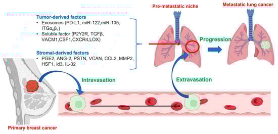 For lung metastasis, there is a rate-limiting step that involves the penetration of BC cells through the lung vasculature [118]. However, CTC may come into contact with as much as 100 m2 of the vascular bed in lung through the circulation, and most of these microcapillaries are smaller than CTC. Therefore, there is a high chance of breast cancer cell arrest in these capillary beds, along with subsequent extravasation into the lung tissue [119]. However, survival of extravasated tumor cells and production of micro-metastasis within the lung tissue is quite rare due to innate immune responses. In order to surpass this hurdle, there are several proposed mechanisms. The first step is producing a favorable microenvironment within the lung tissue by the primary cancer cells called premetastatic niches. The process is started by the secretion of tumor-derived factors and is subsequently accelerated by factors secreted by stromal cells [120]. Furthermore, ANGPTL4, which is secreted by the primary tumor, has the ability to disrupt lung vascular endothelial lining and induces hyperpermeability of the capillaries, leading to the establishment of pulmonary metastases [121]. Disseminated cancer cells that enter this fertile metastatic niche may start their growth to form micro-metastases or remain in a dormant state until the circumstances at the secondary site can support tumor outgrowth [122,123]. The main steps of lung metastasis are described further in Figure 6.