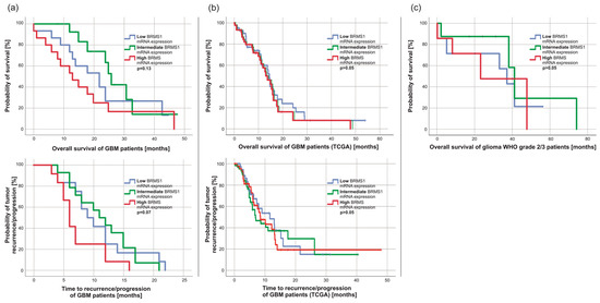 Kaplan-Meier analyses of overall (OS) and progression-free survival (PFS) (a) OS (low BRMS1-mRNA expression: n = 15; intermediate BRMS1-mRNA expression: n = 14, high BRMS1-mRNA expression n = 15; Log Rank: p > 0.05) and PFS of GBM patients from our collective (low BRMS1-mRNA expression: n = 12; intermediate BRMS1-mRNA expression: n = 14, high BRMS1-mRNA expression n = 12; Log Rank: p > 0.05). Six patients died without matching the MRI-based RANO criteria for progress and therefore were excluded from the PFS analyses [53]. (b) OS (low BRMS1-mRNA expression: n = 42, intermediate BRMS1-mRNA expression: n = 65, high BRMS1-mRNA expression: n = 45, Log Rank: p > 0.05) and PFS of GBM patients from the TCGA dataset (low BRMS1-mRNA expression: n = 42, intermediate BRMS1-mRNA expression: n = 65, high BRMS1-mRNA expression: n = 45, Log Rank: p > 0.05). TCGA data were exported from the CBioportal analysis tool [54]. (c) OS of glioma grade 2/3 patients (low BRMS1-mRNA expression: n = 7; intermediate BRMS1-mRNA expression: n = 8; high BRMS1-mRNA expression n = 7; Log Rank: p > 0.05).