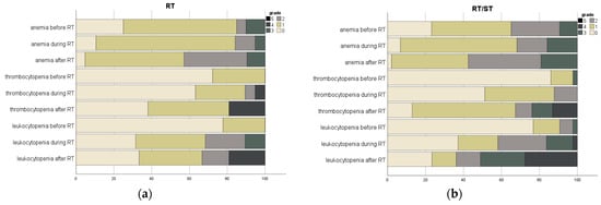Hematological toxicities subdivided into 30 days before radiotherapy (RT), during RT, and up to 90 days after RT. For analysis, the last available laboratory results before RT were used, compared to the highest measured toxicity during and after RT. Evaluation is divided into the RT group (a), receiving monomodal treatment with RT-only, and the RT/ST group (b), treated with concurrent systemic therapy.