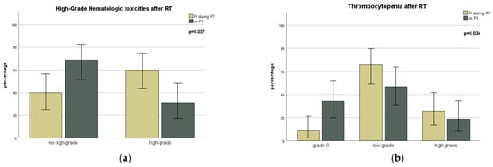 All patients with documented laboratory values developed at least one hematological toxicity (73/82 patients, 89%; see Table 5, Table S1 and Figure 1 for more details). Of these, 37 patients (45.1%) also suffered from at least one high-grade toxicity (grade III or IV). There was no significant difference in overall high-grade toxicities between the RT and RT/ST groups (27.6% vs. 54.7%; p = 0.349). While 61.0% of patients (50 patients) already showed at least one hematological toxicity in the period of 30 days before RT, this proportion increased to 73.2% (60 patients) during RT and 81.7% (67 patients) after RT. High-grade toxicities were seen in seven patients (8.5%) before RT, 16 patients (19.5%) during RT, and 31 patients (37.8%) after RT. Despite no significant difference in high-grade toxicities between the RT and RT/ST groups before and during RT (before RT: 6.9% vs. 9.4%, p = 1.00; during RT: 13.8% vs. 22.6%, p = 0.754), a significant increase in high-grade toxicities was observed in the combined-modality group (17.2% vs. 49.1%, p = 0.018) after RT.