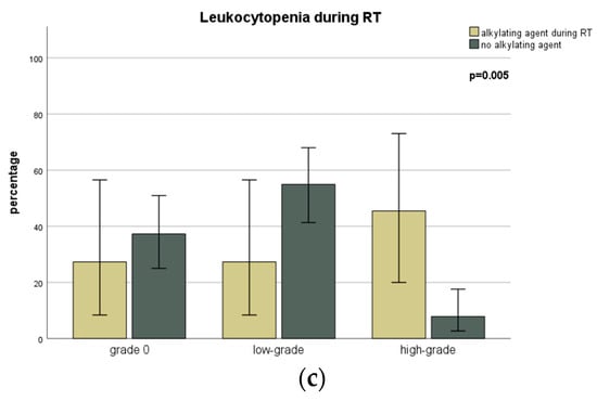 Hematological and non-hematological toxicities were analyzed for each substance class if data on at least 10 patients was available. No decisive analysis of the use of glucocorticoids was performed, as all patients treated with simultaneous ST also received a glucocorticoid (see Table 4 and Table 5 for details). The concurrent use of proteasome inhibitors showed a significant increase in high-grade hematological toxicities after the end of RT (p = 0.027; Figure 2a), especially regarding thrombocytopenia (p = 0.034; Figure 2b). With the use of alkylating agents, there was a significant increase in leukocytopenia during radiotherapy (p = 0.005; Figure 2c). A further significant increase in hematological or non-hematological toxicities during or after RT could not be shown for the different substance classes.