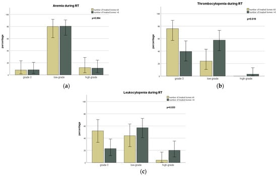 Dichotomous stratification between <40 Gy and ≥40 Gy revealed an increase in low-grade non-hematological toxicities in the ≥40 Gy group (p = 0.004), with no dose-side-effect relationship for high-grade non-hematological toxicities or hematological (low- and high-grade) toxicities. Concerning the number of bones irradiated, it could be shown that simultaneous irradiation of five or more bones led to a significantly higher rate of thrombocytopenia (p = 0.019) and leukocytopenia (p = 0.033) during RT (see Figure 3 for details). This effect was not seen regarding the rate of anemia (p = 0.994).
