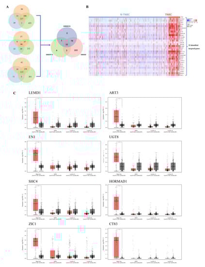 Screening of the high expression genes in TNBC. (A) Venn diagram of the differential genes between TNBC and non-TNBC samples in GEO datasets. (B) The expressions of 32 genes in TNBC and non-TNBC in the TCGA-BRCA cohort. Heat maps represent gene expression levels. (C) The GEPIA analysis of 8 genes with specific high expression in TNBC. Red represents tumor tissues and black represents corresponding normal tissues. * p < 0.05.