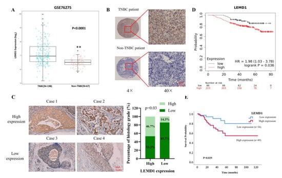 3.1. The High Expression of LEMD1 Is Associated with Poor Prognosis in TNBC