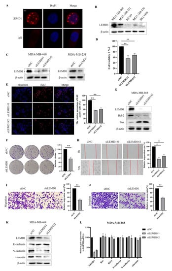 LEMD1 promotes the proliferation and migration of TNBC cells. (A) The subcellular location of LEMD1 was examined in MDA-MB-468 cells by immunofluorescence staining. IgG antibody was used for negative control. The location of the nucleus was indicated by DAPI. (B) The expressions of LEMD1 in TNBC cell lines were examined by Western blot, β-actin was used as a loading control. (C) The expressions of LEMD1 in MDA-MB-468 cells were knocked down by siRNA, and the expressions of LEMD1 in MDA-MB-231 cells were knocked down by shRNA. (D) CCK-8 reagent was applied to examine cell viability of MDA-MB-468 cells. ** p < 0.01, n = 3. (E) Cell proliferation of MDA-MB-468 cells was measured using EdU. Magnification ×100. ** p < 0.01, n = 3. (F) The colony formation assay in LEMD1-knockdown MDA-MB-231 and the corresponding negative control cells were used to examine cell proliferation. ** p < 0.01, n = 3. (G) Western blot analysis of the expressions of Bcl-2 and Bax in MDA-MB-468 cells, β-actin was used as a loading control. (H) Wound healing assays of MDA-MB-468 cells. Magnification ×100. ** p < 0.01, n = 3. Transwell migration assays (I) and Transwell invasion assays (J) in LEMD1-konckdown MDA-MB-231 cells and their corresponding negative control cells. Magnification ×200. ** p < 0.01, n = 3. (K) Western blot analysis of the expressions of E-cadherin, N-cadherin and vimentin in MDA-MB-468 cells, β-actin was used as a loading control. (L) qPCR analysis of the mRNA expressions of Bax, Bcl-2, E-cadherin, N-cadherin and vimentin in MDA-MB-468 cells. The original western blot figures could be found in Supplementary Figure S6A.
