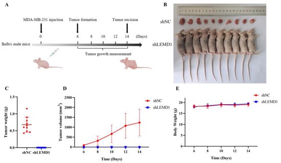 LEMD1 promotes tumor growth in vivo. shNC and shLEMD1 transfected MDA-MB-231 cells were administered subcutaneously into 5-week-old female Balb/c nude mice. (A) Diagram of the in vivo experiment. (B–D) The tumor sizes were monitored on the indicated days. After 2 weeks, the subcutaneous tumors were excised, weighed and photographed. (E) The body weight of the mice was recorded during the experiment.
