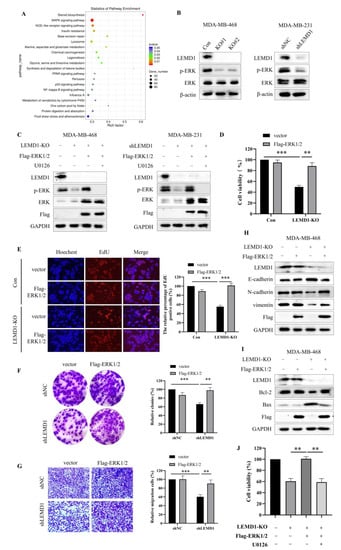 To explore the mechanism underlying the promotive effect of LEMD1 on the progression of TNBC, RNA-seq was conducted to detect the differentially expressed genes in LEMD1-silenced and control MDA-MB-468 cells. MAPK signaling pathway, an important oncogenic pathway regulating ubiquitous signal transduction process in cancers [22], showed significant differential expression in KEGG pathway enrichment analysis (Figure 5A). MAPK consists of ERK, p38, JNK and ERK5. Furthermore, protein–protein network analysis showed that there are close associations between ERK1/2 and the members of MAPK signaling pathway detected by RNA-seq (Supplementary Figure S5A), suggesting that ERK may mediate the carcinogenic role of LEMD1 in TNBC. To validate this hypothesis, we detected the protein expressions of ERK and p-ERK in LEMD1-knockout (KO) and LEMD1-knockdown (KD) cells. Figure 5B showed that LEMD1 knockout or knockdown remarkably down-regulated the expression of p-ERK, but did not change the expression of ERK, indicating that LEMD1 can activate ERK. Next, LEMD1-knockout and LEMD1-knockdown cells were transfected with ERK plasmid and then treated with the ERK inhibitor, U0126. Figure 5C showed that overexpression of ERK increased the expressions of ERK and p-ERK, and the increased p-ERK induced by ERK overexpression can be reversed by U0126. To investigate whether ERK is involved in the regulation of LEMD1 on tumor progression, cell proliferation and migration were measured. As shown in Figure 5D–G and Supplementary Figure S5B,C, the inhibitory effects on the cell proliferation and migration induced by LEMD1-KD/KO were reversed by ERK overexpression in TNBC cells. It has been reported that ERK activation can promote EMT process in various cancers [23,24,25]. ERK activity can also inhibit cancer cell apoptosis by increasing Bcl-2 expression and decreasing Bax expression [26,27]. Consistently, we found that the regulation of E-cadherin, N-cadherin and vimentin expressions by LEMD1-KO/KD was significantly abolished by overexpression of ERK (Figure 5H and Supplementary Figure S5D). Moreover, the increase in Bax expression and the decrease in Bcl-2 expression induced by LEMD1-KO/KD were also rescued by ERK overexpression (Figure 5I and Supplementary Figure S5E). Moreover, cell viability assay also showed that the rescue effect of ERK overexpression in LEMD1-KO/KD cells could be canceled by U0126 treatment (Figure 5J and Supplementary Figure S5F), further confirming the crucial role of ERK activation in mediating the oncogenic role of LEMD1 in TNBC cells. Taken together, these data suggested that LEMD1 promotes the progression of TNBC by activation ERK signaling pathway.