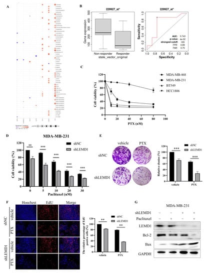 Knockdown of LEMD1 enhances the sensitivity of TNBC cells to paclitaxel. (A) Drug resistance analysis of LEMD1, ART3, UGT8, SHC4, HORMAD1, EN1, ZIC1 and CT83 in breast cancer patients by the GSCALite online tool. Red indicates positive relationship, while purple negative. (B) The receiver operating characteristic (ROC) curve between LEMD1 expression and therapeutic responses to chemotherapy in TNBC cohorts, * p = 0.04. (C) MDA-MB-468, MDA-MB-231, BT549 and HCC1806 cells were treated by paclitaxel with indicated concentration for 72 h. Cell viability was determined via CCK8 assay. (D) MDA-MB-231 cells were transfected with LEMD1 shRNA or a negative control, followed by treatment with paclitaxel for 72 h. Cell viability was determined via CCK8 assay. ** p < 0.01, *** p < 0.001, n = 3. (E) MDA-MB-231 cells were transfected with LEMD1 shRNA and treated with 10 nM paclitaxel. The colony formation assay was conducted. *** p < 0.001, n = 3. (F) MDA-MB-231 cells were transfected with LEMD1 shRNA or a negative control and were treated with 10 nM paclitaxel for 72 h. Then, the cells were subjected to an EdU assay. Magnification ×200. ** p < 0.01, n = 3. (G) MDA-MB-231 cells were transfected with LEMD1 shRNA and were treated with 10 nM paclitaxel for 72 h, the levels of Bcl-2 and Bax were analyzed by Western blot. GAPDH was used as a loading control. The original western blot figures could be found in Supplementary Figure S6C.