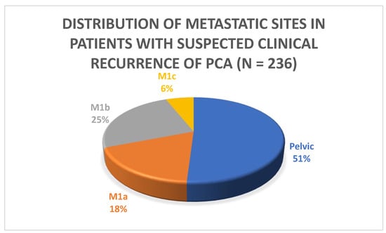 PSMA PET/CT identified at least one PSMA-overexpressing lesion that raised the suspicion for clinical recurrence of PCa in 54% (236/435) of the patients who were part of the study. The majority of the patients (51%) had pelvic disease defined as either local (i.e., surgical bed) or regional nodal metastasis (N1). Extra-pelvic nodal involvement (M1a) was observed in 18% (43/236) of patients. Bone involvement was noted in 25% (59/236) of patients, and visceral metastasis was found in 5.9% (14/236) of patients, as indicated in Table 3 and Figure 1 and Figure 2. Of these visceral metastases, the majority, 76% (11/14), were pulmonary. Among patients with distant metastatic disease, 100% were oligometastatic in the BCR low-risk group (Figure 3) compared to 81% in the BCR high-risk group (p < 0.001). Moreover, a significantly higher percentage of local recurrence was found in the BCR low-risk group (26% vs. 6%, p < 0.001).