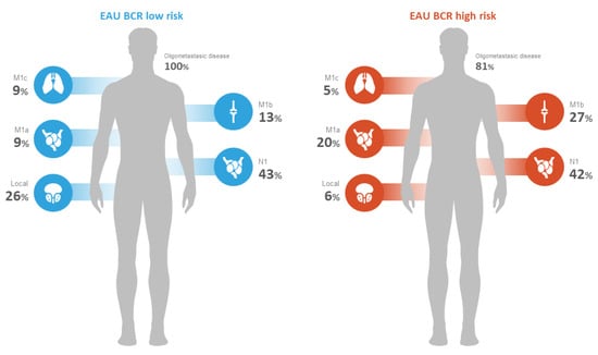 - Ferdinandus, J.; Fendler, W.P.; Farolfi, A.; Washington, S.; Mohammad, O.; Pampaloni, M.H.; Scott, P.J.; Rodnick, M.; Viglianti, B.L.; Eiber, M.; et al. PSMA PET Validates Higher Rates of Metastatic Disease for European Association of Urology Biochemical Recurrence Risk Groups: An International Multicenter Study. J. Nucl. Med. 2022, 63, 76–80. [Google Scholar] [CrossRef] [PubMed]