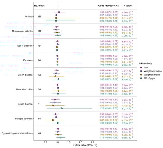 Chicago/Turabian StyleYin, Qiushi, Qiuxi Yang, Wenjie Shi, Ulf D. Kahlert, Zhongyi Li, Shibu Lin, Qifeng Song, Weiqiang Fan, Li Wang, Yi Zhu, and et al. 2023. "Mendelian Randomization Analyses of Chronic Immune-Mediated Diseases, Circulating Inflammatory Biomarkers, and Cytokines in Relation to Liver Cancer" Cancers 15, no. 11: 2930. https://doi.org/10.3390/cancers15112930