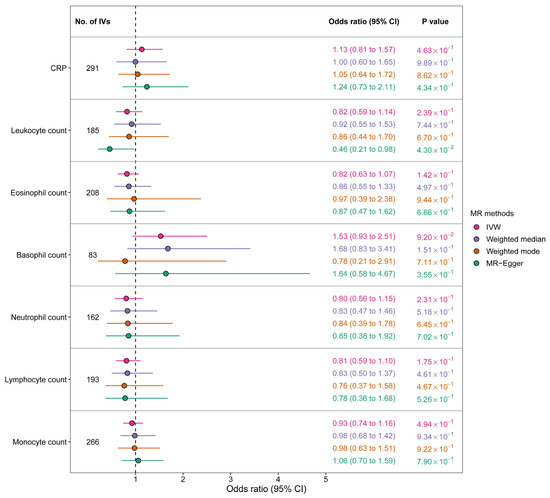 APA StyleYin, Q., Yang, Q., Shi, W., Kahlert, U. D., Li, Z., Lin, S., Song, Q., Fan, W., Wang, L., Zhu, Y., & Huang, X. (2023). Mendelian Randomization Analyses of Chronic Immune-Mediated Diseases, Circulating Inflammatory Biomarkers, and Cytokines in Relation to Liver Cancer. Cancers, 15(11), 2930. https://doi.org/10.3390/cancers15112930