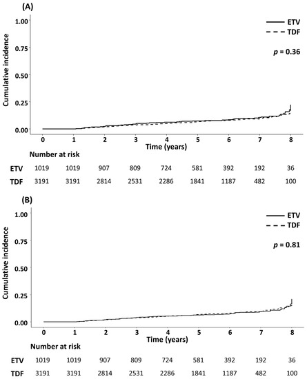 - Oh, H.; Yoon, E.L.; Jun, D.W.; Ahn, S.B.; Lee, H.-Y.; Jeong, J.Y.; Kim, H.S.; Jeong, S.W.; Kim, S.E.; Shim, J.-J.; et al. No difference in incidence of hepatocellular carcinoma in patients with chronic hepatitis B virus infection treated with entecavir vs tenofovir. Clin. Gastroenterol. Hepatol. 2020, 18, 2793–2802.e6. [Google Scholar] [CrossRef]