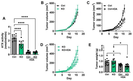 (A) Plasma ATX activity of C57BL/6J-ENPP2fl/fl (Ctrl) and C57BL/6J-ENPP2fl/flAdipoq-Cre+ (KO) mice with or without IOA-289 (IOA) treatment (gavaged twice a day at 100 mg/kg body weight for 5 days). Plasma was collected between 1–3 h after the final dose of IOA-289. n = 9 per group. (B–D) Daily tumor volume and (E) tumor weight of Ctrl and KO mice with or without IOA treatment (gavaged twice a day at 100 mg/kg body weight). n = 14 per group, * p < 0.05, **** p < 0.0001.