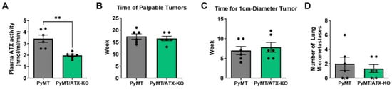 (A) Plasma ATX activity of MMTV-PyMT (PyMT) and MMTV-PyMT-ENPP2fl/flAdipoq-Cre+ (PyMT/ATX-KO) mice. (B) Ages of palpable tumors can be observed in PyMT and PyMT/ATX-KO mice. (C) Time of formation of 1 cm-diameter tumors since being palpable in PyMT and PyMT-ATX-KO mice. (D) Numbers of micro-metastases in lung sections of PyMT and PyMT-ATX-KO mice. ** p < 0.01.