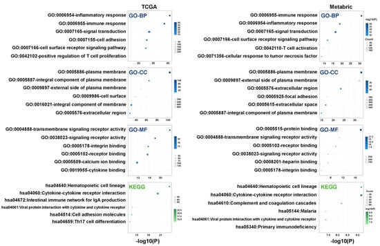 GO and KEGG pathway enrichment analysis for ENPP2 correlated genes from TCGA and Metabric data sets. Six biological processes (BP), cellular components (CC), molecular functions (MF), and KEGG pathways where these genes are most significantly enriched were shown as bubble charts.