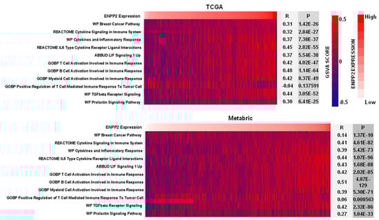 Gene set variation analysis (GSVA) for ENPP2 in TCGA and Metabric data sets. GSVA scores for gene sets with different gene ontology terms were calculated and expressed as heat maps. Pearson correlation analysis was performed to determine the correlation between ENPP2 expression and these gene ontology terms (biological functions) in human breast tumors.